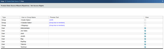 7. The next window allows you to set who has the ability to use this data source by setting up access rights. Simply check the checkbox next to the user(s) or group(s) you wish to give access and click Next.