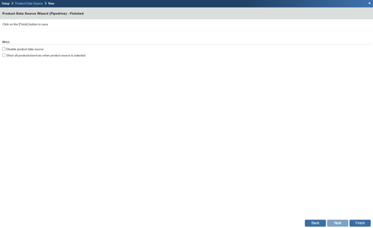 8. On the Finished page you can choose to disable the product data source and/or show all products/services when the product source is selected. Once you have made your selections click Finish. The newly created product data source will now be available in your list of configured data sources and available to select products and services from in the Product Lookup window.