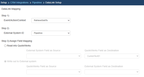 3. On the next window (DataLink Mapping), change the first drop-down menu to RetrieveSoldTo, RetrieveShipTo, or RetrieveBillTo. Your selection here will determine when the field from your CRM is pulled into QuoteWerks (i.e. the filed data is pulled in when pulling the contact details into the Sold to, Ship to, or Bill to fields).