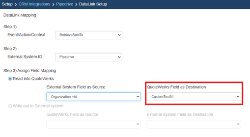 With the above DataLink configured the Organization ID will populate CustomText01 when you retrieve the sold to contact in QuoteWerks.