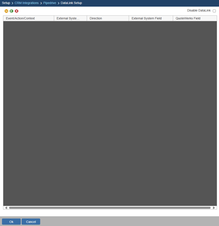 1. Navigate to the CRM Integration page and click on DataLink. The DataLink Setup window will open. If you have not created a DataLink yet, the field will be blank. If you have, it will list the DataLinks here.