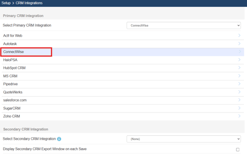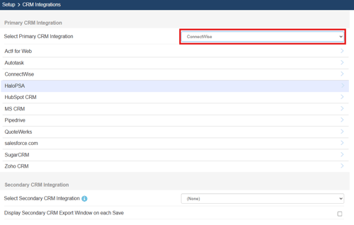1. To begin, navigate to Setup -> CRM Integrations. Select the PSA you would like to integrate with from the Select Primary CRM Integration dropdown menu.