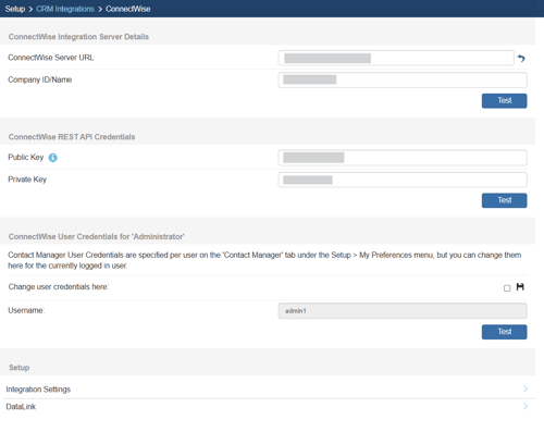 3. Input your credentials including your ConnectWise Server URL, Company ID/Name, REST API credentials, and user credentials. You can click Test to test the connection. Click OK to save your changes.