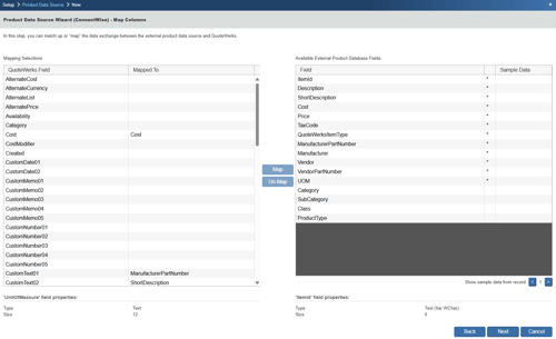 4. Map the fields from your PSA to fields in the QuoteWerks system by selecting the fields you wish to map and clicking the Map button. Once all desired fields have been mapped click the Next button.