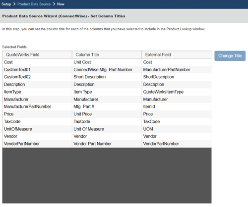 6. You can rename the column title if you wish to do so. Simply click on the row you wish to adjust and click the Change Title button. This will bring up a window where you can rename the column title. Once you have renamed your columns click Next.