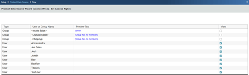 7. The next window allows you to set who has the ability to use this data source by setting up access rights. Simply check the checkbox next to the user(s) or group(s) you wish to give access and click Next.
