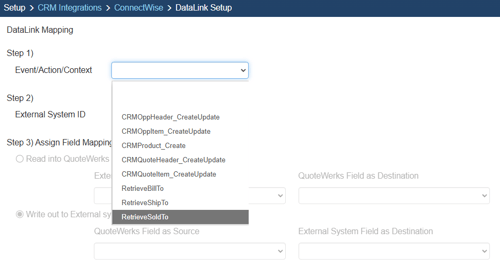 3. On the next window (DataLink Mapping), change the first drop-down menu to RetrieveSoldTo, RetrieveShipTo, or RetrieveBillTo. Your selection here will determine when the field from your CRM is pulled into QuoteWerks (i.e. the filed data is pulled in when pulling the contact details into the Sold to, Ship to, or Bill to fields).