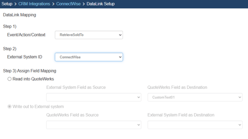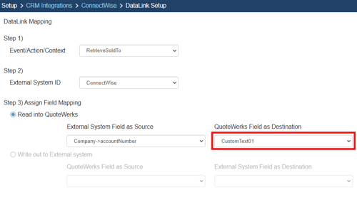 With the above DataLink configured the Account Number will populate CustomText01 when you retrieve the sold to contact in QuoteWerks.