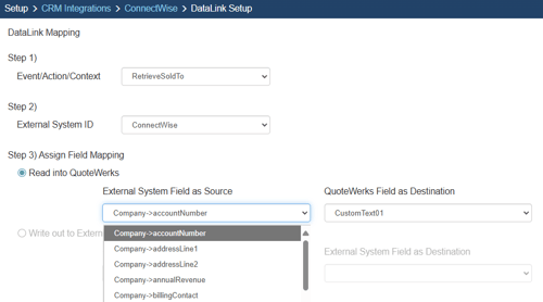 7. Once your External System Field as Source is selected, choose the QuoteWerks field that you would like the data from your CRM to populate in the QuoteWerks Field as a Destination.
