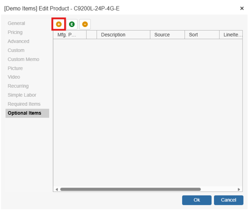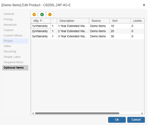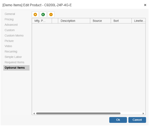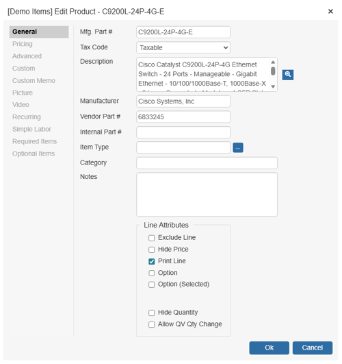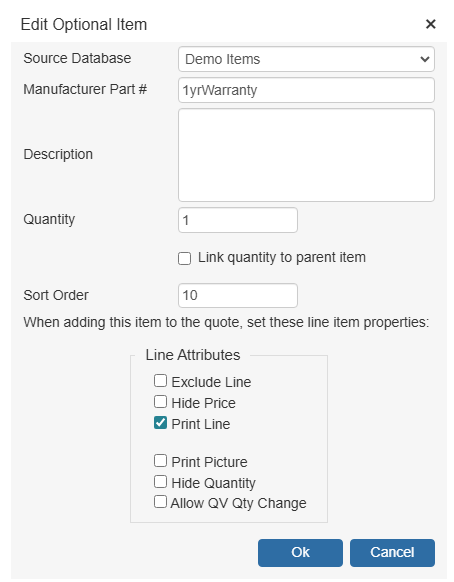 6. In the Edit Optional Item window you can configure a number of settings. Here you can change the Manufacturer Part #, Description, Quantity, Sort Order, Line Type, and Line Attributes. These settings are described in more detail under Optional Item Properties.
