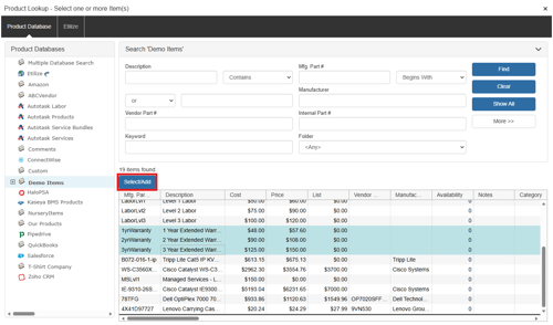 5. Search for the item(s) you wish to include as optional items using the Product Lookup window. Select them and click Select/Add to add them to the list of Optional Items.