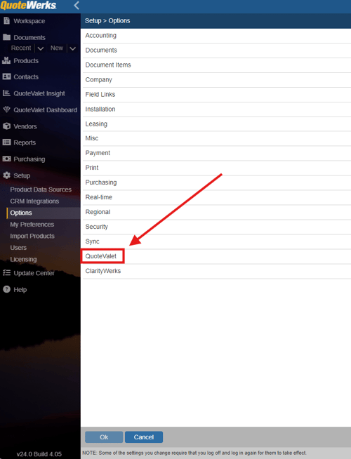 The QuoteValet setup is located in the Setup -> Options menu, under the QuoteValet page.