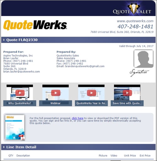 QuoteValet supports videos for any document uploaded to QuoteValet. The videos need to be uploaded to YouTube first and can then be displayed on the QuoteValet document. Single or multiple videos can be displayed for a document as well as videos for individual line items. QuoteValet also supports default videos for every type of document (quotes, orders, invoices) created in QuoteWerks so users do not have to remember to manually include videos on documents.