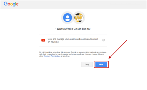3. Login into your YouTube account you would like to use for QuoteValet videos then select Allow on the confirmation screen. If you are already logged in, simply select Allow.