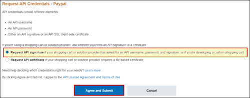 5. Select "Request API Signature" option and click on the [Agree and Submit] button.