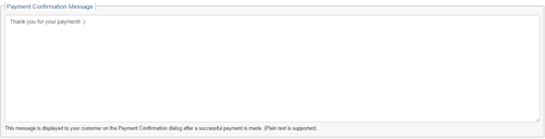 The Payment Confirmation Message is the message that will be displayed after a successful payment is made. Type into this message to set your default and then click [Save].