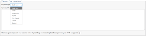 The Payment Type Instructions are displayed on the payment page. These instructions enable users to set a specific message when selecting a payment option. For example, if you wanted to give the customer the option to pay by check, you could create a specific set of instructions that display when the customer selects the payment option of "Check". This could include who to mark the attention to on the envelope as well as confirm the proper address to send the check too. For wire transfer, you could include your wire transfer account information.