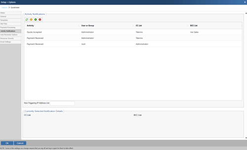 The Activity Notifications Tab enables users to specify who receives the QuoteValet Notifications for key QuoteValet events. Events include when a quote has been accepted, when payment has been made, when a QuoteValet Mobile quote has been created, when a OrderForm order has been placed, the document first view notification, when a document is approved/not approved, and when a Peer Review comment has been posted. Users can add additional users/email addresses to receive a CC or BCC of the notification. This is especially useful for keeping the accounting department in the loop when payments are received and for keeping sales managers in the loop when quotes are accepted.