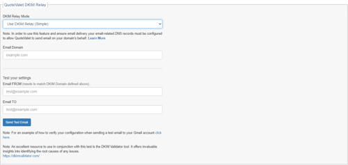 Note: You will likely need to configure the QuoteValet DKIM Relay settings below to ensure delivery.