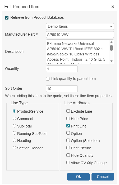 5. In the Edit Required Item window you can configure a number of settings. Here you can change the Manufacturer Part #, Description, Quantity, Sort Order, Line Type, and Line Attributes. These settings are described in more detail under Required Item Properties.