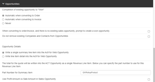 ACT! for Web Opportunities require part numbers for all line items. As such, if you choose this option, you will need to specify a part number in the “Part Number for Summary Item” field. This is the part number that will be assigned to the summary item in the Products and Services tab of the ACT! for Web Opportunity window.