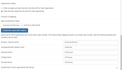 You can choose which field in QuoteWerks to map to the corresponding field (ItemName, PartNumber, etc.) in your CRM. You can select the ManufacturerPartNumber, InternalPartNumber, ItemType, and more.