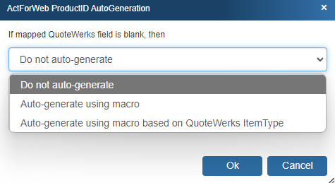 To use the auto-generation feature, select an option other than ManufacturerPartNumber from the Map QuoteWerks Field drop-down box, then click the [PartNumber generation options] button.