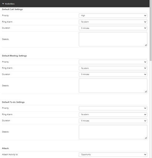 Here you can set the default settings for Activities (calls, meetings, to-dos) created by QuoteWerks in Act! for Web including the priority, Alarm, Duration, Details, and whether the activities are attached to the Opportunity or the Contact.