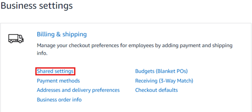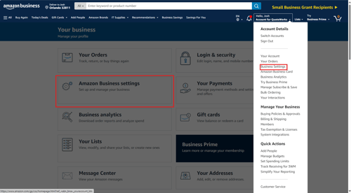 2. After creating your account and/or logging into your Amazon Business Account, navigate to the "Business Settings" link. This can be done in the Account Details menu and selecting Amazon Business Setting or by clicking into the Your Business page and selecting Business Settings.
