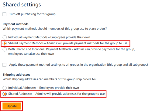 4. In "Shared Settings", click "Shared Payment Methods" and "Shared Addresses" and click the update button. This will set this option and bring you back to the "Business Settings" page.