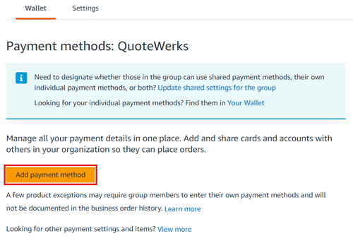 6. In the Payment Methods section, click "Add Payment Method" or select an existing payment method and go back to Business Settings.