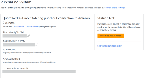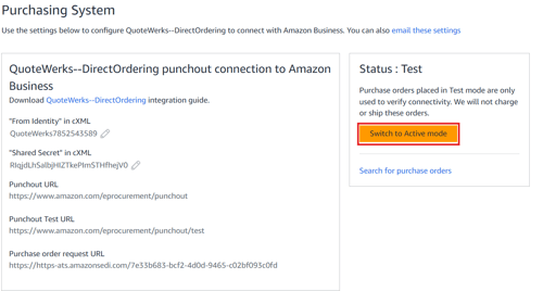 10. Once you click Save you will be in "Test" mode. You must have a payment method added to your account before switching to Active mode. Copy the System Login, Password, and Purchase Order Request URL over to QuoteWerks.