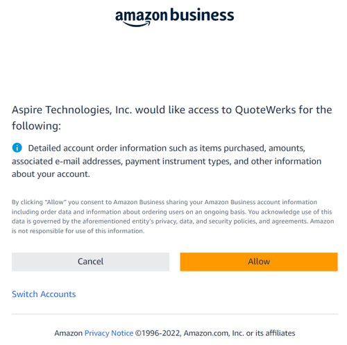 12. Click Connect and you will be directed to an Amazon Business page to allow the integration. Click Allow.