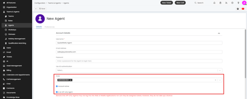 5. Input information for this user. Make sure they are given the Administrator role, the account is set to Active and Is an API-only Agent is selected. Scroll to the bottom of the page and click Save.