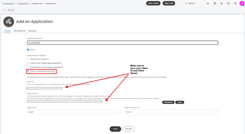7. Name your application something that is easy to identify as being connected to your QuoteWerks integration. Below I have used the name "QuoteWerks." You will want to verify that the Active checkbox is selected, that Client ID and Secret (Services) is selected under Authentication Method, and that you copy and save both your Client ID and Client Secret. These will be used in QuoteWerks to set up the integration.