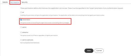 9. Next, click into the Permissions tab. There is a long list of settings here. Select all:standard. Scroll to the bottom of the page and click Save.