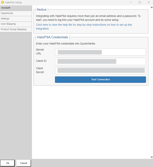 On the Account tab you will want to input your Server URL (the URL you use to sign into HaloPSA), your Client ID, and Client Secret. For instructions on how to get these please review Obtaining your HaloPSA Credentials.