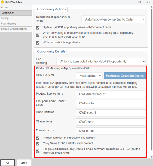 If selected, the Manufacturer Part Number from QuoteWerks will be written into the SKU field in HaloPSA.