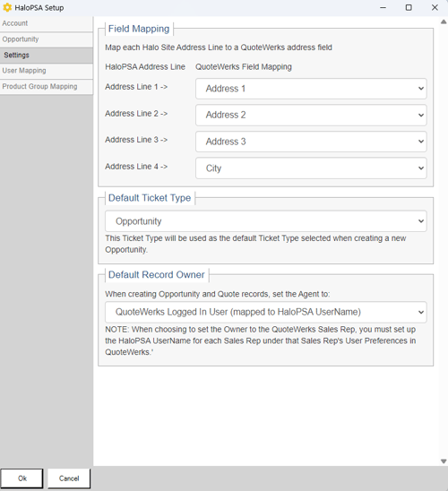 You will use this section to map each Halo Site Address Line to a QuoteWerks address field. You can do this by using the drop down menus in the QuoteWerks Field Mapping column and selecting the appropriate fields.