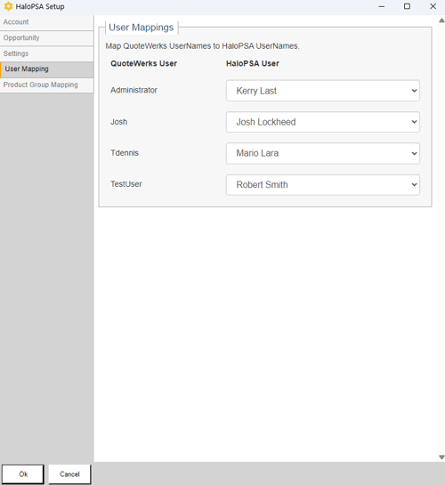 Click on the User Mappings tab on the left-hand side of the window. This is where you can map QuoteWerks UserNames to HaloPSA UserNames. This is an important setting to ensure that as opportunities and quotes are shared between systems the appropriate user is being assigned.