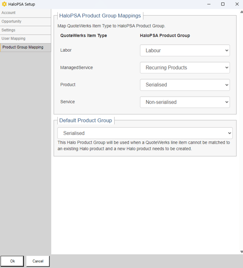 Click on the Product Group Mapping tab on the left-hand side of the window. This is where you can map QuoteWerks Item Types to HaloPSA Product Groups. This is an important setting to ensure that as opportunities and quotes are shared between systems the appropriate Product Group is being assigned.