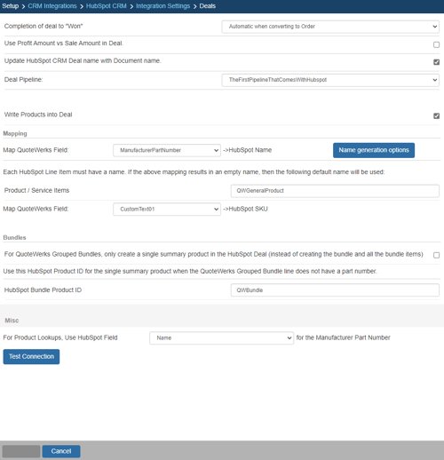This option will carry over the QuoteWerks document name to the HubSpot Deal name.