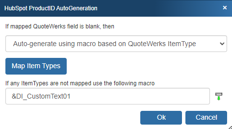 With this option, when exporting items to the HubSpot CRM Opportunity, instead of just using a simple field value like the ManufacturerPartNumber to become the HubSpot CRM Name, you can choose to have the HubSpot CRM Name Product ID auto-generated using a macro using the QuoteWerks Item Type field (such as product, service, labor, etc.). Click on the [Map Item Types] button to map your existing QuoteWerks Item Types with the macros for Product ID Name generation.