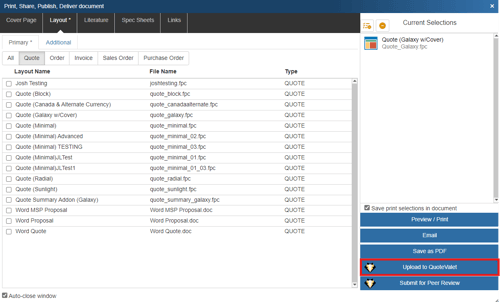 On the Print Document Window where you select your layouts (File-> Print) an Upload to QuoteValet button is available.