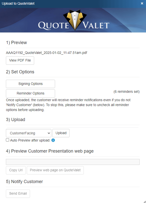 The Auto Preview after upload checkbox will automatically launch the quote in preview mode when your upload completes to the QuoteValet server.