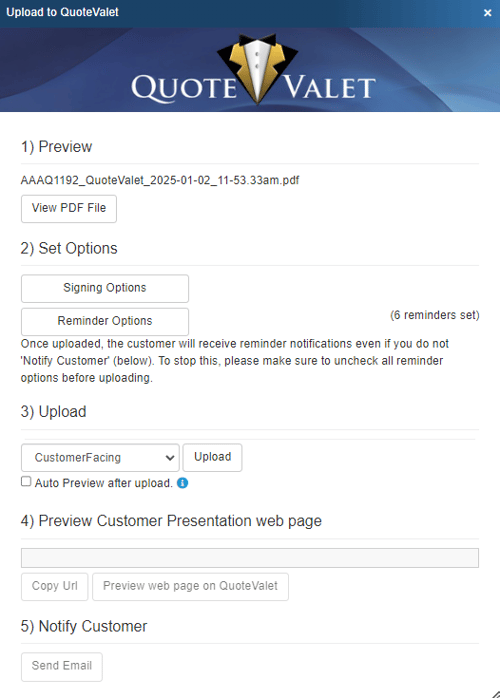 Once the document has been prepared to be uploaded to QuoteValet, an “Upload to QuoteValet” window will appear with four options.