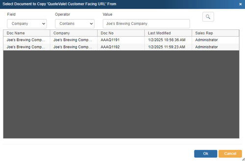2. This will open the Select Document window. You can search for another document by DocName, DocNumber, or by Company to include in the email.