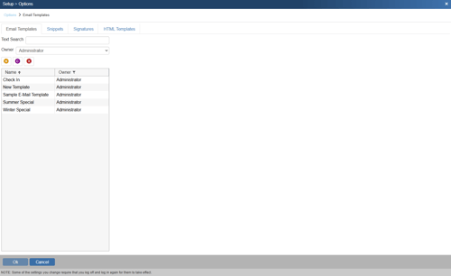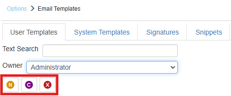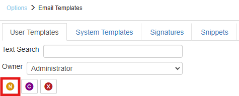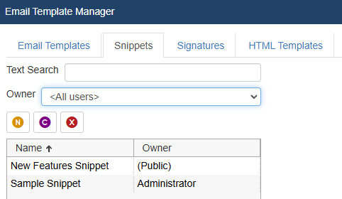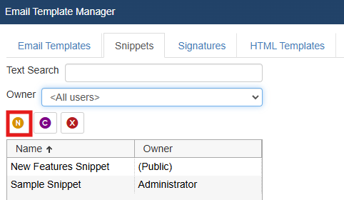 To create a new Snippet, first choose the “Snippets” tab from the Customize Email Templates menu option. Choose which user you would like to create the new Snippet for under the “Owner” drop down menu and then click on the
