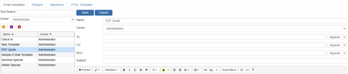 The last section on the email template is the “Include in list of available templates when editing” options. Here the user defines which type of email the current open template will be associated with by checking the appropriate box.