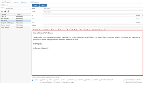 QuoteWerks supports email templates for users. This functionality allows users to create and customize email templates in QuoteWerks for quotes, orders, invoices, and QuoteValet emails. The templates can also be setup for Peer Review and Quote Approvals and Acceptance emails.